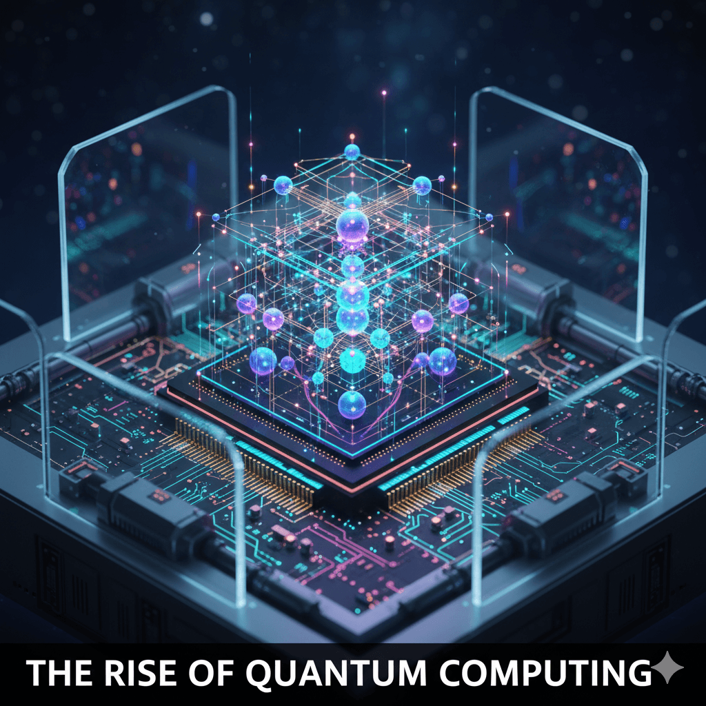 An abstract representation of a quantum computer's processor, with glowing qubits interconnected in a complex, futuristic pattern, suggesting immense computational power.