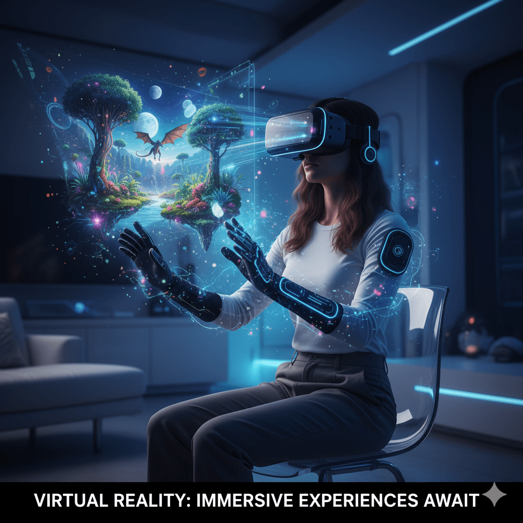 A person wearing a sleek VR headset, deeply immersed in a vibrant, fantastical virtual world, with digital elements extending into their physical space.